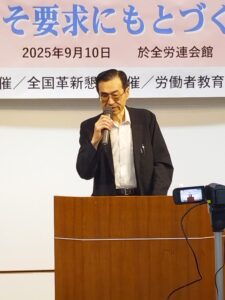 「激動する情勢のもとでの統一戦線運動」のテーマで講演した五十嵐仁さん(全国革新懇代表世話人、労教協会長 写真)は参院選の結果について、「与党の大惨敗は裏金問題に対処できず、物価高に対する経済無策で国民に見放された結果だ。自民党は崖っぷち、末期的症状を呈しており、『解党的出直し』が言われるが、解党だけでよい」と指摘。石破首相の辞任表明(7日)も、独自色を出せず「安倍亜流に終始して四面楚歌に陥ったため」と批判しました。