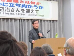 この講演会は昨年から計画していましたが、自民党が総選挙で大勝した直後の開催となり、「高市政権とは何か、いかに立ち向かうか」のテーマは時機ぴったり。渡辺さんは、自民党大勝の要因として第一に、「新自由主義政治への不満が、自民党が消費税減税や積極財政を掲げて〝新自由主義の修正〟に転じ、有権者を取り込んだこと」。第二に、「高市氏が改憲・軍拡の右翼的主張を選挙戦で前面に出さず、経済政策中心で支持を広げたこと」。第三に、「中道勢力が『市民と野党の共闘』から離脱し、小選挙区で自民党が圧勝したことである」とまとめられました。「これから高市政権は、減税と積極財政を掲げつつ、実際には社会保障や医療制度の大幅削減、軍拡と戦争体制づくりを加速し、明文改憲やスパイ防止法制定などを狙っている」と指摘。「対抗するには、『市民と野党の共闘』を再構築し、改憲や軍拡、社会保障改悪に反対する一点共闘を積み重ねること」と訴えました。