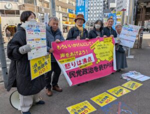 革新・愛知の会は2月2日、代表世話人を先頭に、「平和・くらし・民主主義の3つの共同目標の実現をすすめる政治勢力の前進を」と、金山駅北口で訴えました。
