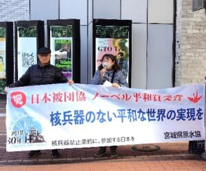 スピーチに立った川名直子宮城県原水協事務局長と芳地博光宮城革新懇常任世話人も、イラン攻撃の即時中止を訴えました。この日の行動には9人が参加。45分間の行動で、「核兵器禁止条約への参加を求める署名」を20筆、「非核三原則署名を守り実行を求める署名」を10筆が寄せられました。