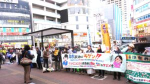 「SNSで見たので」「近くで宣伝がないかな、と思っていたら行動のお知らせを見て」と、宣伝開始前の17時ごろから続ぞくと人が集まる大宣伝行動となりました。千葉市や松戸市から来た参加者もいました。日音響のギターの演奏と歌声に、「歌っていいですか」と飛び込みで一緒に歌う人、「私もマイクで訴えたい」という人も。ペンライト持参で参加した人も多く、コールでは100本を超える色とりどりのペンライトの光と、「憲法守れ、戦争反対」の声が駅周辺に響きました。最後に「つばさをください」の合唱で締めくくりました。通行人からも、「頑張って」「いいね」などの声掛けもいただきました。